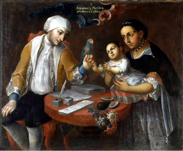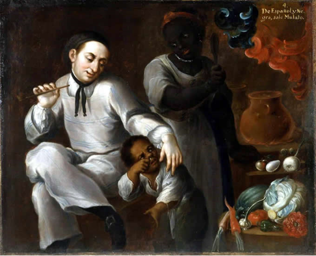 “De Español y Negra, sale Mulato” is the title for one of the sixteen casta paintings from the Mexican painter José Joaquín Magón, brought to Spain from Mexico between 1766 to 1772. The painting depicts the union of a Spanish man and Black woman as well as their offspring, a mulatto child, that also denotes a unique racial configuration or casta.